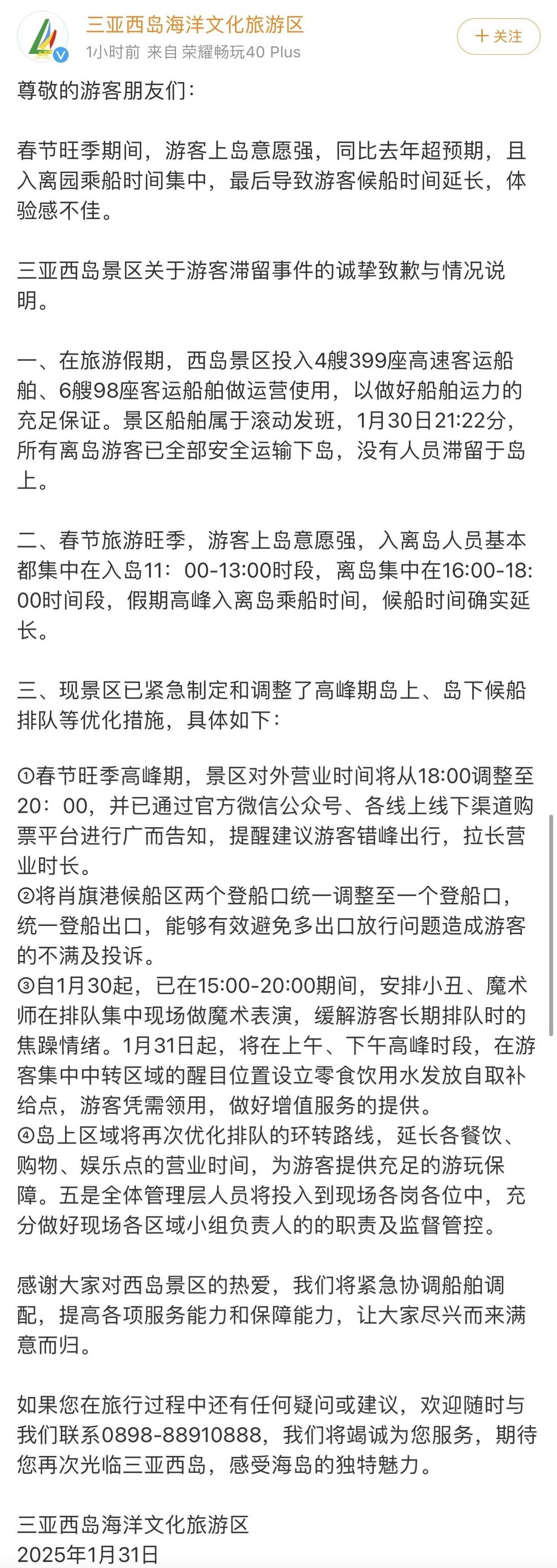 三亚西岛景区关于游客滞留事件的诚挚致歉与情况说明。